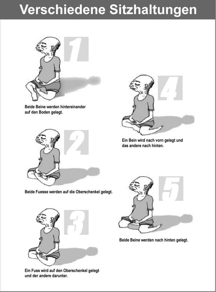 Nach der Gehmeditation machen wir in sitzender Haltung weiter. Wie bei der Gehmeditation sollten wir zuerst entspannen. Dazu nehmen wir einen tiefen Atemzug. Entspannung ist eine der ersten Bedingungen, damit Achtsamkeit entstehen kann. Nachdem wir entspannt sind und einen klaren Geist haben, richten wir unsere Achtsamkeit auf die Bauchdecke. Wenn wir ein- und ausatmen, gibt es eine durch die Atmung verursachte Bauch deckenbewegung. Wir nennen die Aufwärts- oder Aufbewegung das „Heben“. Wir nennen die Abwärts- oder Abbewegung das „Senken“. Wenn Anfänger diese Bewegung nicht gut erkennen können, können sie die Hände auf die Bauchdecke legen oder dort falten. Damit ihr die Bewegung besser spürt, nehmt ein paar tiefe Atemzüge. Wenn die Bauchdecke sich hebt, sagt mental „Heben“ und wenn sie sich senkt, sagt mental „Senken“. Wenn unser Geist denkt, schläfrig ist oder stumpf, dann können wir die hebende oder fallende Empfindung überhaupt nicht spüren. Wenn die hebende oder senkende Bewegung nicht da ist, heißt das gewöhnlich, dass wir nicht achtsam sind. Es ist genauso wie in der Gehmeditation, zuerst seid achtsam und dann folgt achtsam dem Objekt. Wenn wir erst mal dem Heben und Senken mit Achtsamkeit folgen können, wird die Konzentration aufgebaut.