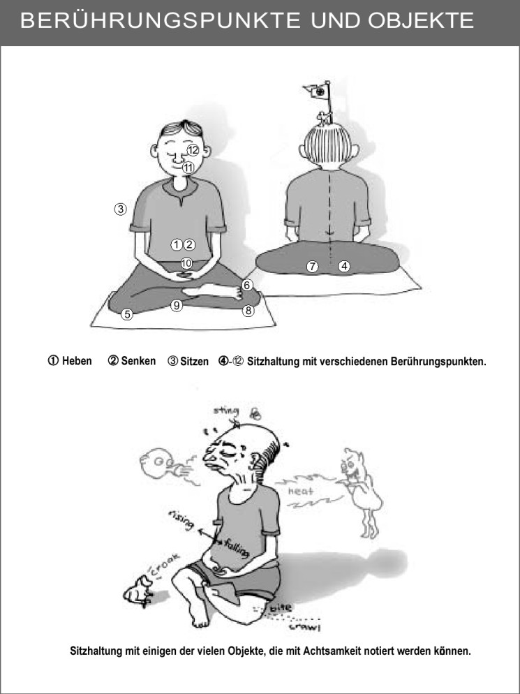 Berühren Man beobachtet den Ort, wo der Hintern und die Beine im Kontakt mit dem Sitz sind. Auf die Art können einige Berührungspunkte wahrgenommen werden. Man kann diese Berührungspunkte nun systematisch beobachten um die Konzentration zu erhöhen. Die mit dem Beobachten verbrachte Zeit eines Punktes variiert mit dem geistigen Zustand und der Klarheit des Objektes. Je klarer das Objekt, umso länger kann man es beobachten. Wenn es undeutlich oder man selbst schläfrig ist, dann muss man sich schneller von einem zum anderen Objekt bewegen. „Berühren“ wird abwechselnd mit „Sitzen“ notiert. Wie auch bei anderen Objekten, beobachten wir tatsächlich die Eigenschaften der entstehenden und vergehenden Elemente, wenn wir „Berühren“ notieren.