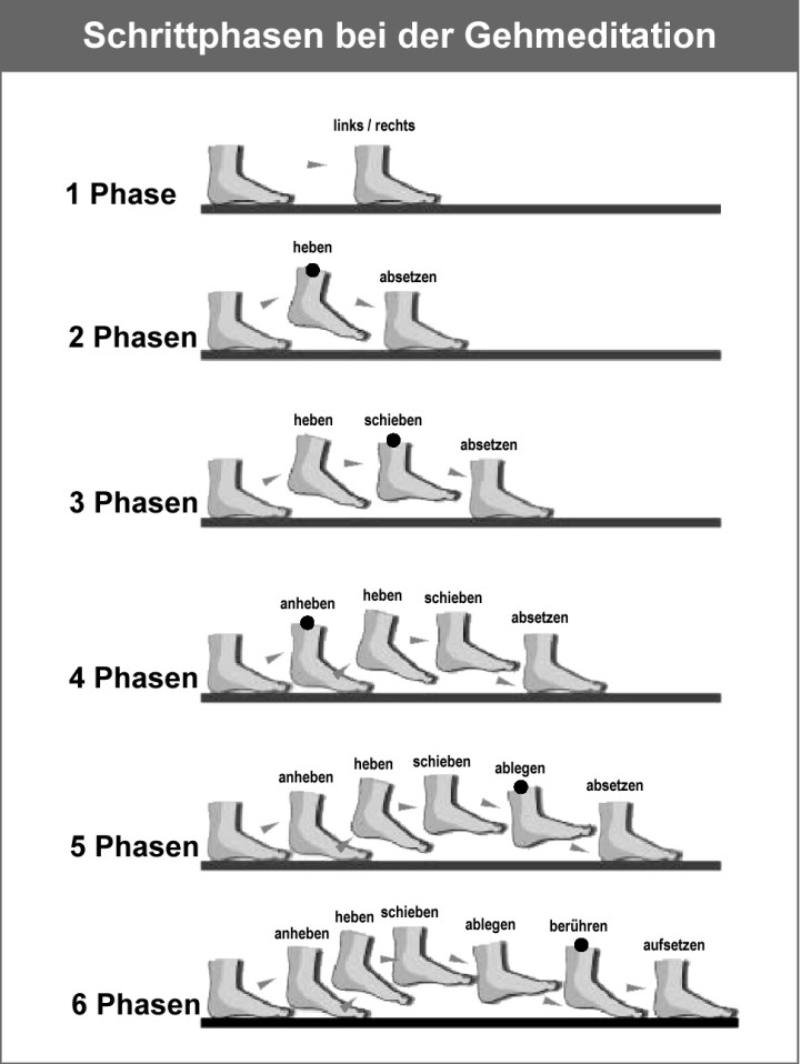 Die Gehmeditation sollte in entspannter, kräftiger Art, abhängig davon, ob überschüssige Energie da ist oder fehlt, ausgeführt werden. Hier kommt nun auch das Balancieren der Fähigkeiten ins Spiel. Andere Erscheinungen, die während des Gehens beobachtet werden, sind Geräusche, Schmerz, Absicht, Sehen und Hören. Man hält an um sie zu notieren, wenn sie andauernd und dominant sind.
